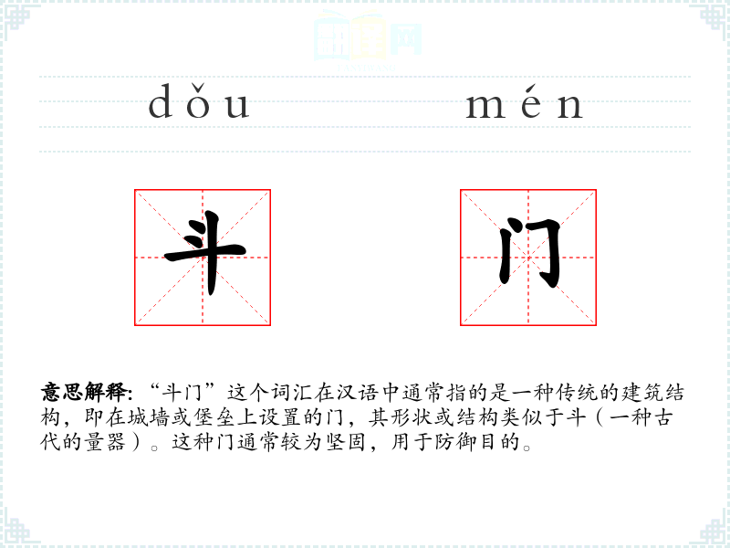 - 反义词:无(由于“斗门”特指一种防御性建筑,没有直接的反义词)