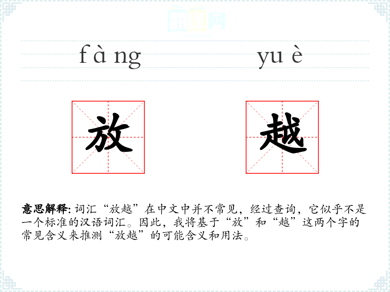 “放”字的基本含义包括释放、放松、放置等,而“越”字则有超越、越过、更加等含义。结合这两个字,“放越”可能意味着释放并超越某种限制或界限。