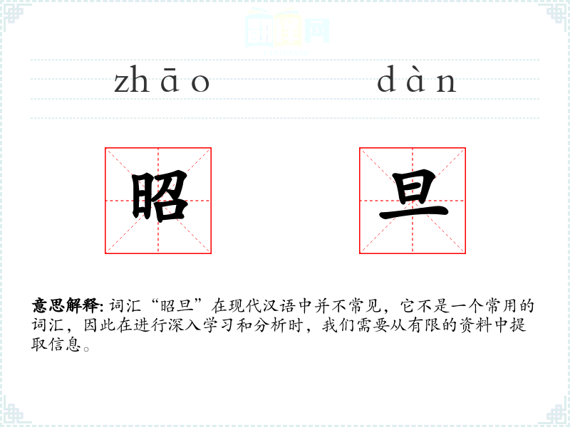词汇“昭旦”在现代汉语中并不常见,它不是一个常用的词汇,因此在进行深入学习和分析时,我们需要从有限的资料中提取信息。
