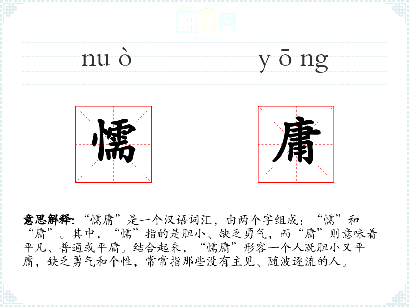 “懦庸”是一个汉语词汇,由两个字组成:“懦”和“庸”。其中,“懦”指的是胆小、缺乏勇气,而“庸”则意味着平凡、普通或平庸。结合起来,“懦庸”形容一个人既胆小又平庸,缺乏勇气和个性,常常指那些没有主见、随波逐流的人。