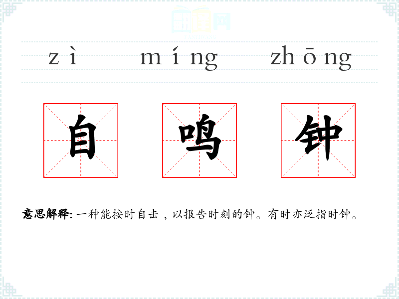 一种能按时自击﹐以报告时刻的钟。有时亦泛指时钟。
