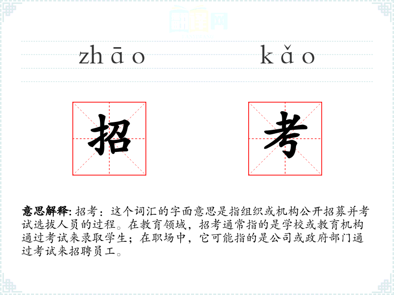 招考:这个词汇的字面意思是指组织或机构公开招募并考试选拔人员的过程。在教育领域,招考通常指的是学校或教育机构通过考试来录取学生;在职场中,它可能指的是公司或政府部门通过考试来招聘员工。