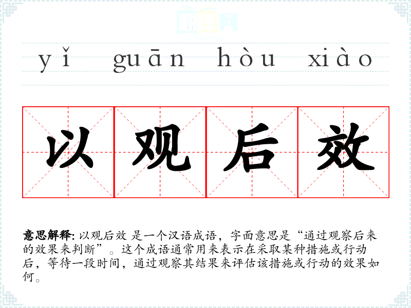 - 文学:在文学作品中,这个成语可以用来描述人物对某件事情的耐心等待和审慎评估,如“他决定先不采取行动,以观后效。”