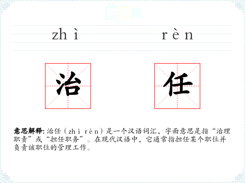 治任(zhì rèn)是一个汉语词汇,字面意思是指“治理职责”或“担任职务”。在现代汉语中,它通常指担任某个职位并负责该职位的管理工作。