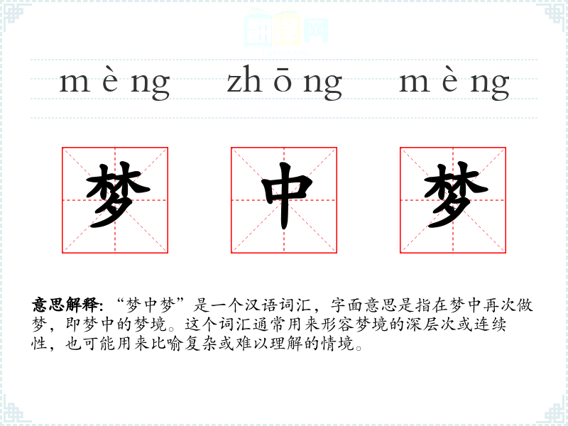 “梦中梦”这个词汇在汉语中有着悠久的历史,其词源可以追溯到古代文学作品中对梦境的描述。随着时间的推移,这个词的用法和含义逐渐丰富,成为描述复杂心理状态或超现实情境的常用词汇。