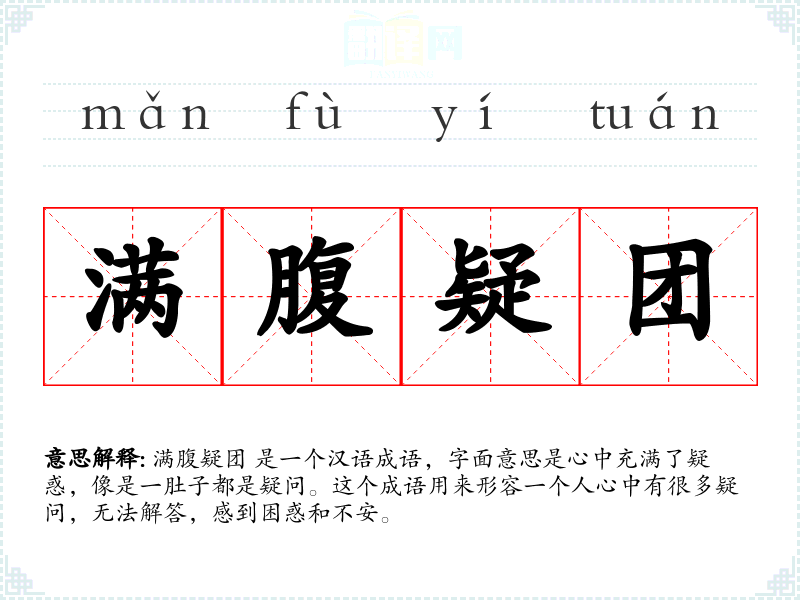 满腹疑团 是一个汉语成语,字面意思是心中充满了疑惑,像是一肚子都是疑问。这个成语用来形容一个人心中有很多疑问,无法解答,感到困惑和不安。