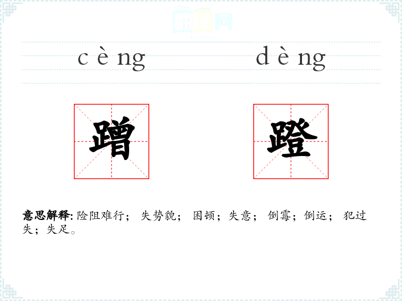 险阻难行; 失势貌; 困顿;失意; 倒霉;倒运; 犯过失;失足。