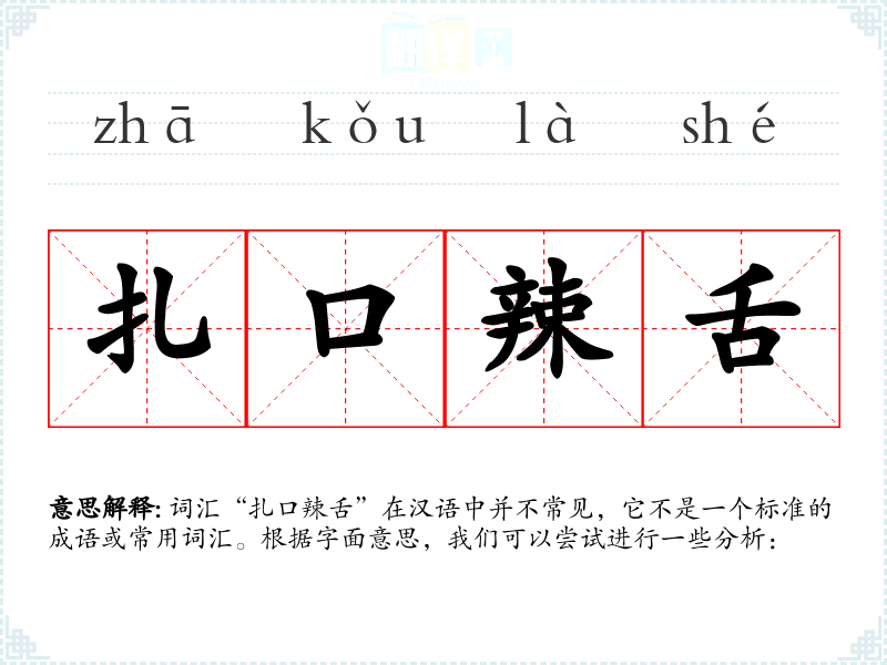 词汇“扎口辣舌”在汉语中并不常见,它不是一个标准的成语或常用词汇。根据字面意思,我们可以尝试进行一些分析: