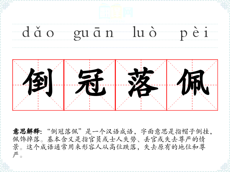 “倒冠落佩”是一个汉语成语,字面意思是指帽子倒挂,佩饰掉落。基本含义是指官员或士人失势、丢官或失去尊严的情景。这个成语通常用来形容人从高位跌落,失去原有的地位和尊严。