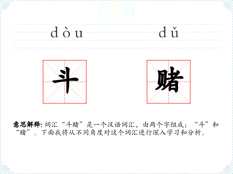 词汇“斗赌”是一个汉语词汇,由两个字组成:“斗”和“赌”。下面我将从不同角度对这个词汇进行深入学*和分析。