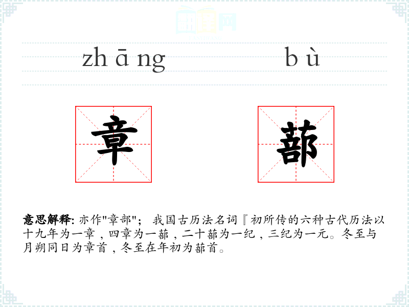 亦作"章部"; 我国古历法名词『初所传的六种古代历法以十九年为一章﹐四章为一蔀﹐二十蔀为一纪﹐三纪为一元。冬至与月朔同日为章首﹐冬至在年初为蔀首。
