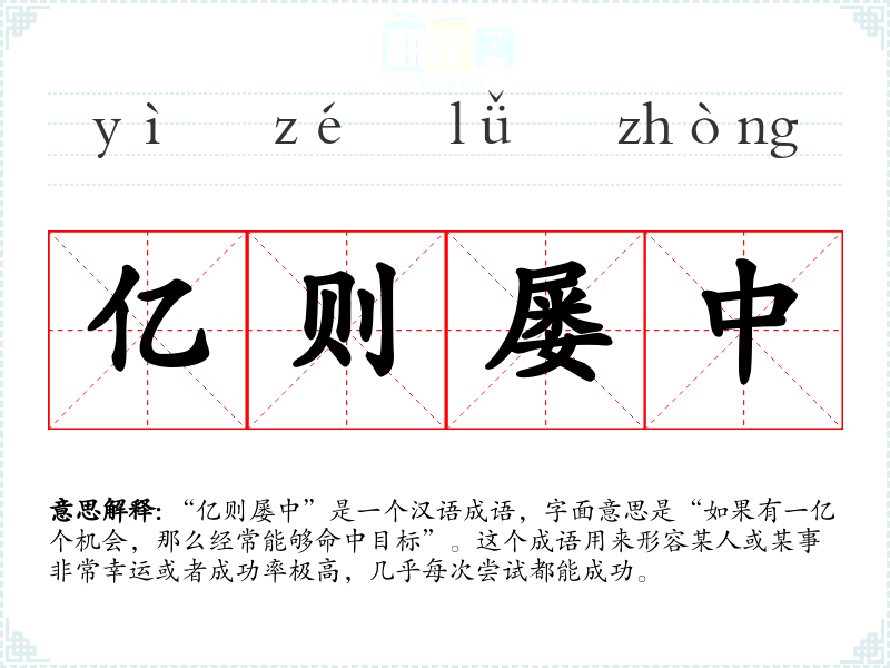 “亿则屡中”是一个汉语成语,字面意思是“如果有一亿个机会,那么经常能够命中目标”。这个成语用来形容某人或某事非常幸运或者成功率极高,几乎每次尝试都能成功。