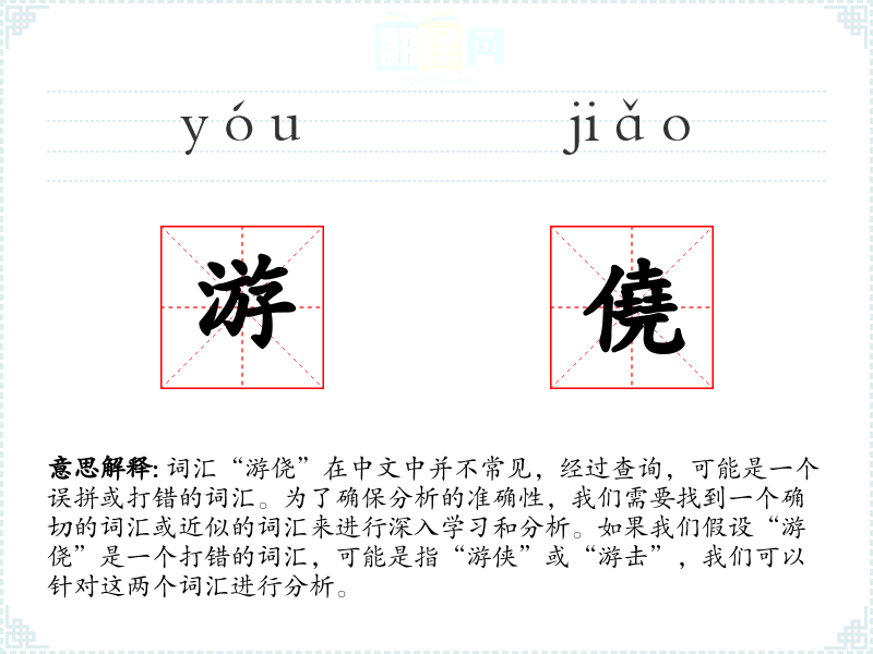 词汇“游侥”在中文中并不常见,经过查询,可能是一个误拼或打错的词汇。为了确保分析的准确性,我们需要找到一个确切的词汇或近似的词汇来进行深入学*和分析。如果我们假设“游侥”是一个打错的词汇,可能是指“游侠”或“游击”,我们可以针对这两个词汇进行分析。