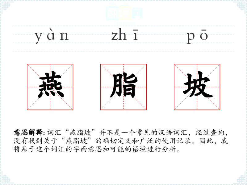 “燕脂坡”字面意思可能是指一个地名,其中“燕脂”可能指的是某种颜色或物质,而“坡”则指的是斜坡或山坡。然而,由于缺乏具体的历史文献或现代使用记录,这个词汇的确切含义不明确。