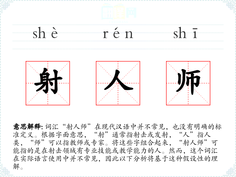 词汇“射人师”在现代汉语中并不常见,也没有明确的标准定义。根据字面意思,“射”通常指射击或发射,“人”指人类,“师”可以指教师或专家。将这些字组合起来,“射人师”可能指的是在射击领域有专业技能或教学能力的人。然而,这个词汇在实际语言使用中并不常见,因此以下分析将基于这种假设性的理解。