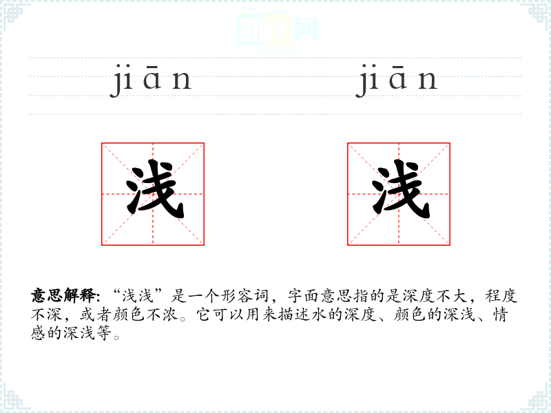 “浅浅”是一个形容词,字面意思指的是深度不大,程度不深,或者颜色不浓。它可以用来描述水的深度、颜色的深浅、情感的深浅等。