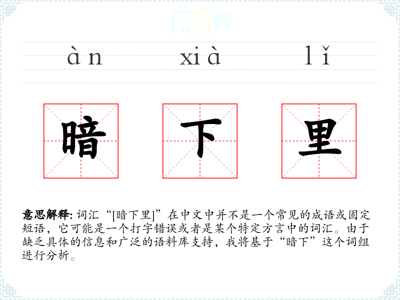 词汇“[暗下里]”在中文中并不是一个常见的成语或固定短语,它可能是一个打字错误或者是某个特定方言中的词汇。由于缺乏具体的信息和广泛的语料库支持,我将基于“暗下”这个词组进行分析。
