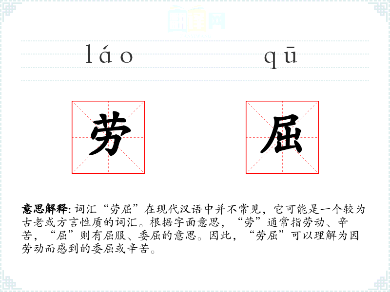 - 理解:“劳屈”这个词反映了劳动者在劳动过程中的情感状态,虽然在现代汉语中不常见,但在文学和社会学领域仍有其价值。
