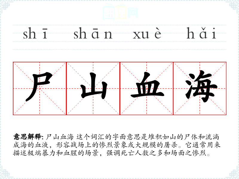 尸山血海 这个词汇的字面意思是堆积如山的尸体和流淌成海的血液,形容战场上的惨烈景象或***的屠杀。它通常用来描述极端暴力和血腥的场景,强调死亡人数之多和场面之惨烈。