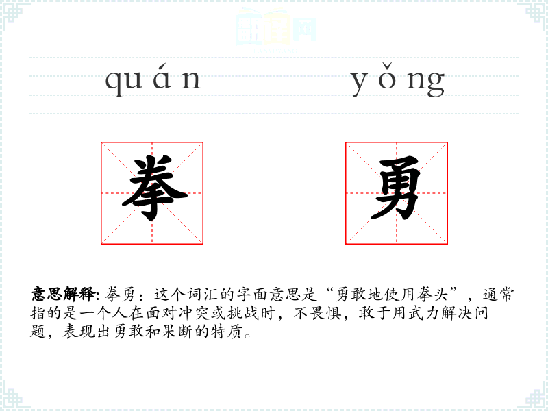拳勇:这个词汇的字面意思是“勇敢地使用拳头”,通常指的是一个人在面对冲突或挑战时,不畏惧,敢于用武力解决问题,表现出勇敢和果断的特质。