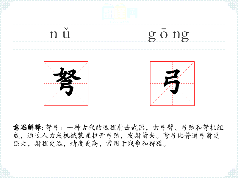- 同义词:弓箭、弓弩、弩机