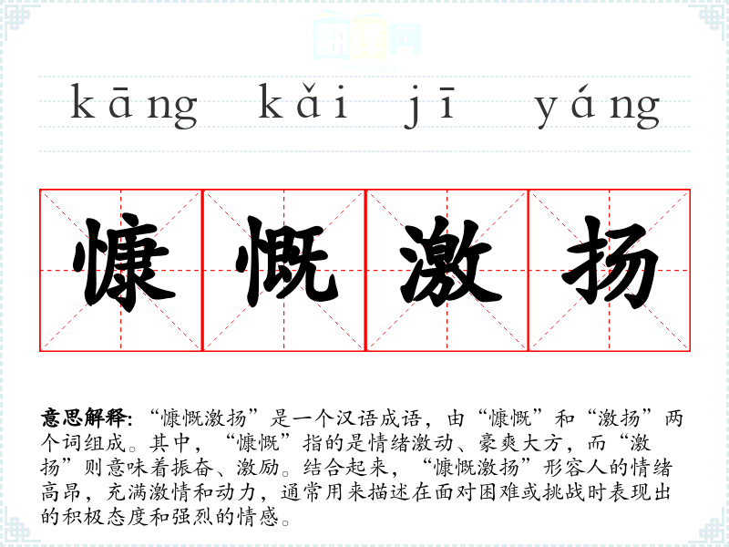 “慷慨激扬”是一个汉语成语,由“慷慨”和“激扬”两个词组成。其中,“慷慨”指的是情绪激动、豪爽大方,而“激扬”则意味着振奋、激励。结合起来,“慷慨激扬”形容人的情绪高昂,充满激情和动力,通常用来描述在面对困难或挑战时表现出的积极态度和强烈的情感。