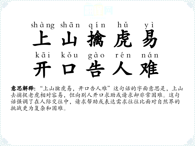 “上山擒虎易,开口告人难”这句话的字面意思是,上山去捕捉**相对容易,但向别人开口求助或请求却非常困难。这句话强调了在人际交往中,请求帮助或表达需求往往比面对自然界的挑战更为复杂和困难。