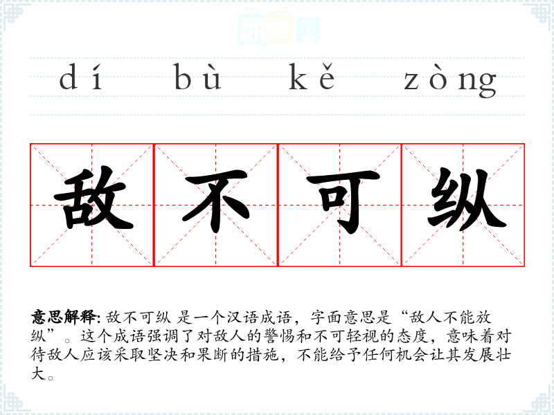 敌不可纵 是一个汉语成语,字面意思是“敌人不能放纵”。这个成语强调了对敌人的警惕和不可轻视的态度,意味着对待敌人应该采取坚决和果断的措施,不能给予任何机会让其发展壮大。