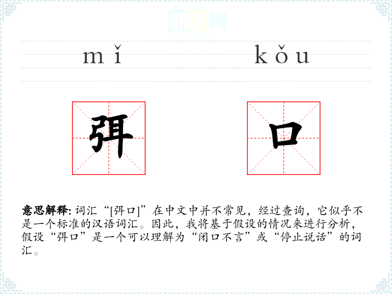 词汇“[弭口]”在中文中并不常见,经过查询,它似乎不是一个标准的汉语词汇。因此,我将基于假设的情况来进行分析,假设“弭口”是一个可以理解为“闭口不言”或“停止说话”的词汇。
