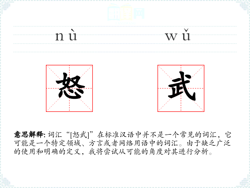 词汇“[怒武]”在标准汉语中并不是一个常见的词汇,它可能是一个特定领域、方言或者网络用语中的词汇。由于缺乏广泛的使用和明确的定义,我将尝试从可能的角度对其进行分析。