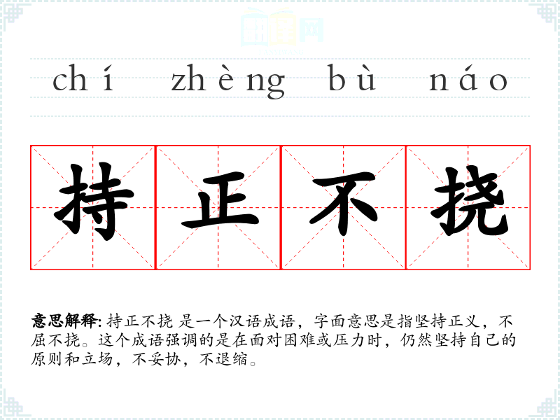 持正不挠 是一个汉语成语,字面意思是指坚持正义,不屈不挠。这个成语强调的是在面对困难或压力时,仍然坚持自己的原则和立场,不妥协,不退缩。