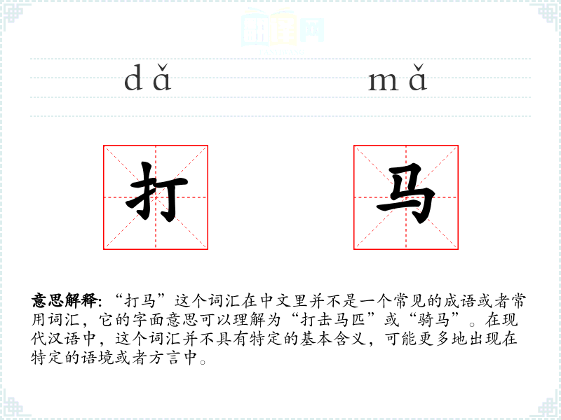 - 反义词:无(由于“打马”不是一个常用词汇,反义词不明显)