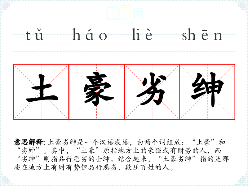 土豪劣绅是一个汉语成语,由两个词组成:“土豪”和“劣绅”。其中,“土豪”原指地方上的豪强或有财势的人,而“劣绅”则指品行恶劣的士绅。结合起来,“土豪劣绅”指的是那些在地方上有财有势但品行恶劣、欺压百姓的人。