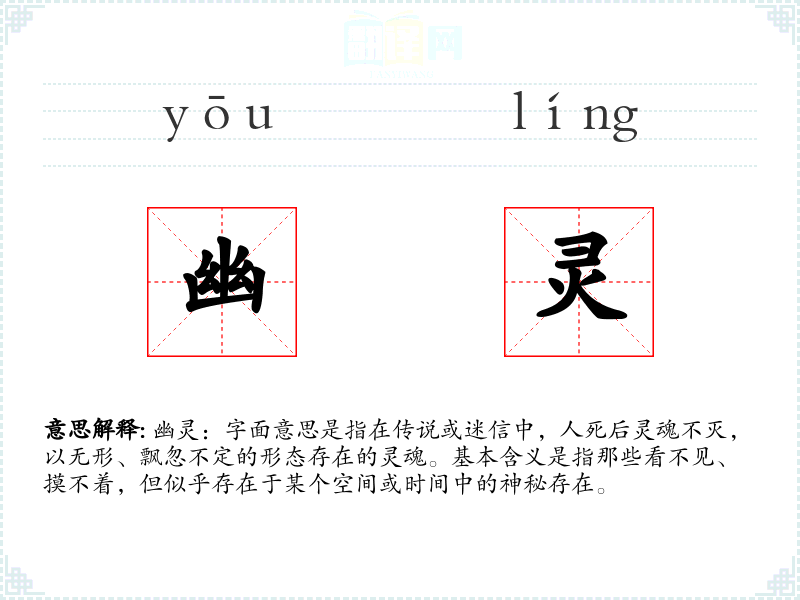 幽灵:字面意思是指在传说或迷信中,人死后灵魂不灭,以无形、飘忽不定的形态存在的灵魂。基本含义是指那些看不见、摸不着,但似乎存在于某个空间或时间中的神秘存在。