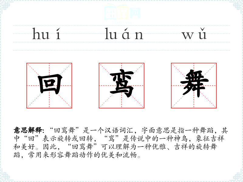 “回鸾舞”是一个汉语词汇,字面意思是指一种舞蹈,其中“回”表示旋转或回转,“鸾”是传说中的一种神鸟,象征吉祥和美好。因此,“回鸾舞”可以理解为一种优雅、吉祥的旋转舞蹈,常用来形容舞蹈动作的优美和流畅。