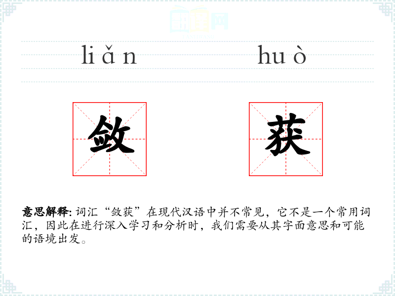 词汇“敛获”在现代汉语中并不常见,它不是一个常用词汇,因此在进行深入学习和分析时,我们需要从其字面意思和可能的语境出发。