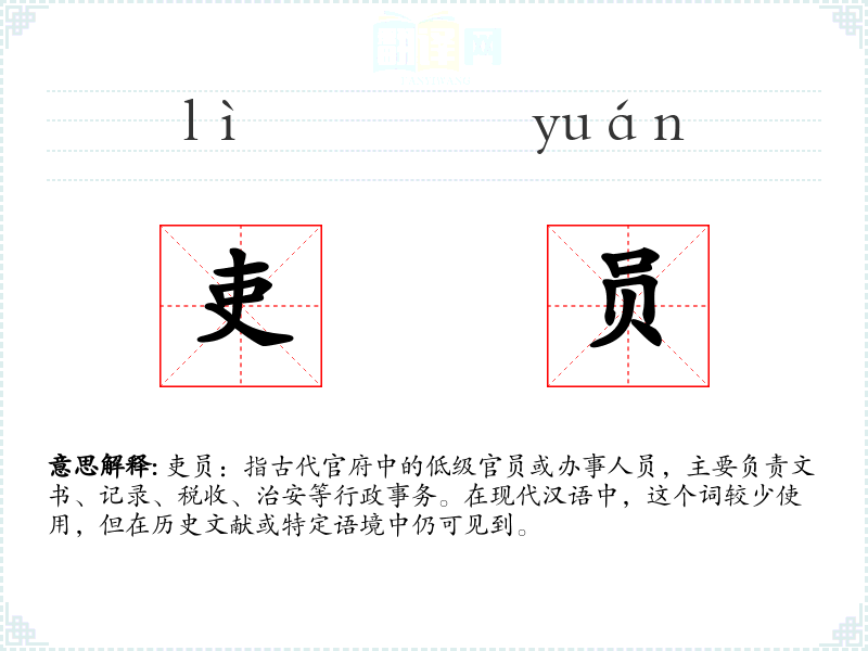 吏员:指古代官府中的低级官员或办事人员,主要负责文书、记录、税收、治安等行政事务。在现代汉语中,这个词较少使用,但在历史文献或特定语境中仍可见到。
