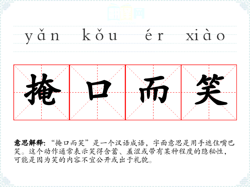 “掩口而笑”是一个汉语成语,字面意思是用手遮住嘴巴笑。这个动作通常表示笑得含蓄、羞涩或带有某种程度的隐秘性,可能是因为笑的内容不宜公开或出于礼貌。