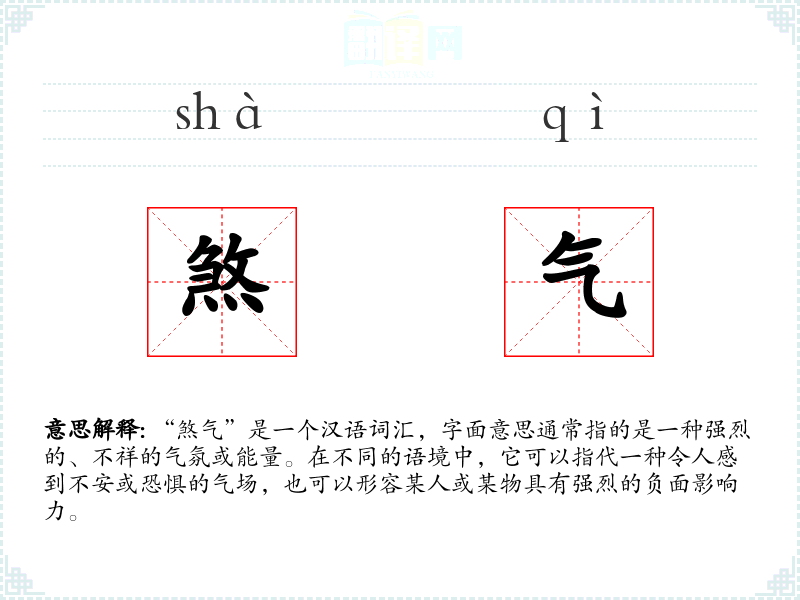 “煞气”是一个汉语词汇,字面意思通常指的是一种强烈的、不祥的气氛或能量。在不同的语境中,它可以指代一种令人感到不安或恐惧的气场,也可以形容某人或某物具有强烈的负面影响力。
