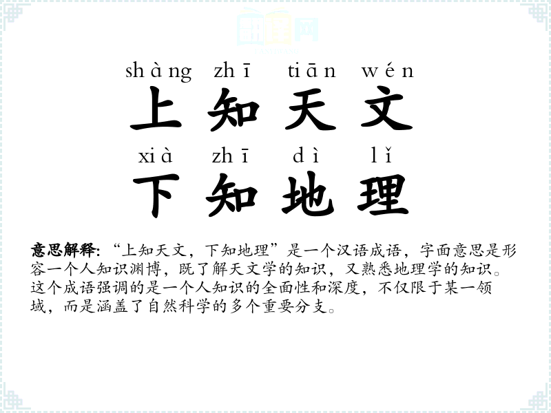 “上知天文,下知地理”是一个汉语成语,字面意思是形容一个人知识渊博,既了解天文学的知识,又熟悉地理学的知识。这个成语强调的是一个人知识的全面性和深度,不仅限于某一领域,而是涵盖了自然科学的多个重要分支。