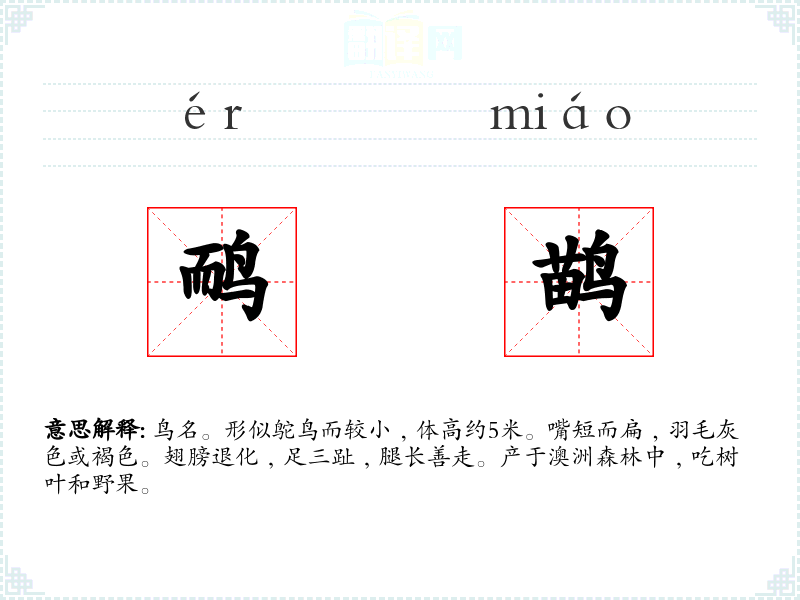 鸟名。形似鸵鸟而较小﹐体高约5米。嘴短而扁﹐羽毛灰色或褐色。翅膀退化﹐足三趾﹐腿长善走。产于澳洲森林中﹐吃树叶和野果。