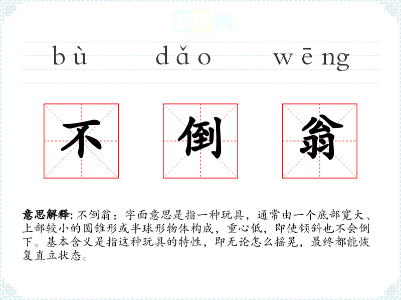 不倒翁:字面意思是指一种玩具,通常由一个底部宽大、上部较小的圆锥形或半球形物体构成,重心低,即使倾斜也不会倒下。基本含义是指这种玩具的特性,即无论怎么摇晃,最终都能恢复直立状态。