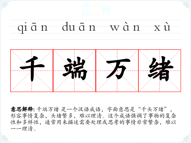 千端万绪 是一个汉语成语,字面意思是“千头万绪”,形容事情复杂,头绪繁多,难以理清。这个成语强调了事物的复杂性和多样性,通常用来描述需要处理或思考的事情非常繁杂,难以一一理清。
