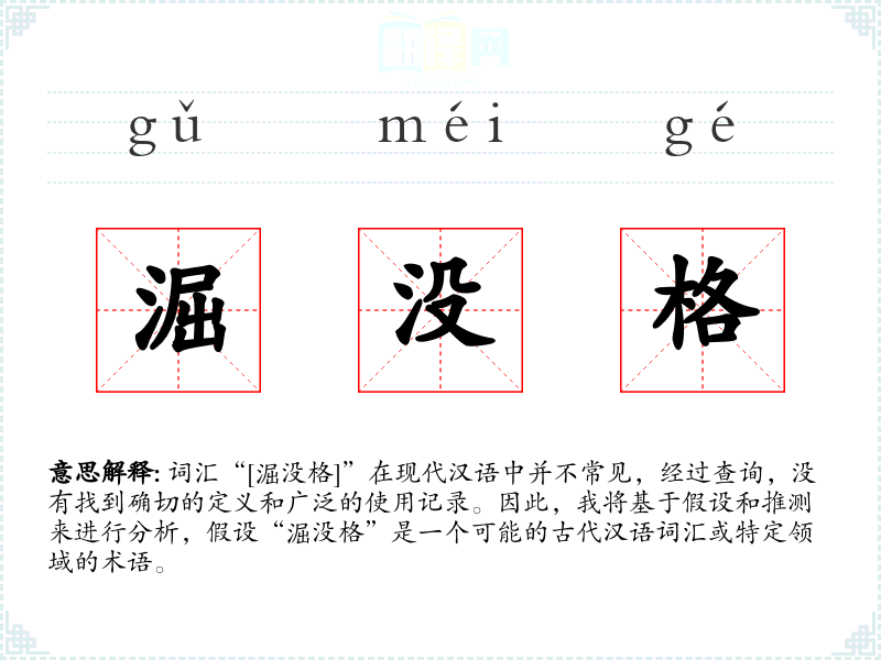 词汇“[淈没格]”在现代汉语中并不常见,经过查询,没有找到确切的定义和广泛的使用记录。因此,我将基于假设和推测来进行分析,假设“淈没格”是一个可能的古代汉语词汇或特定领域的术语。