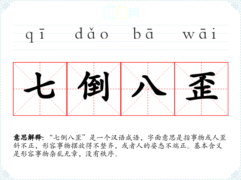 “七倒八歪”是一个汉语成语,字面意思是指事物或人歪斜不正,形容事物摆放得不整齐,或者人的姿态不端正。基本含义是形容事物杂乱无章,没有秩序。