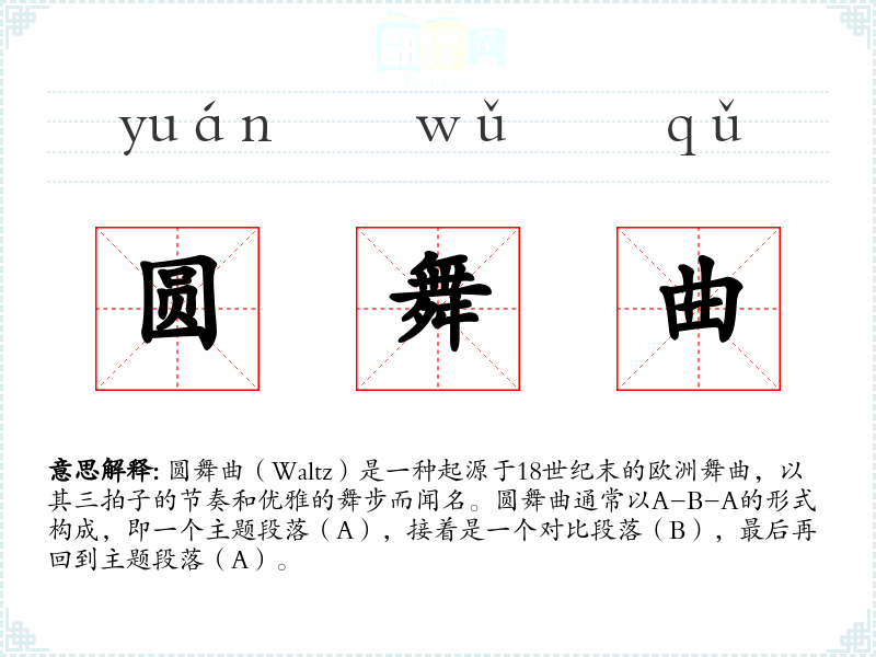 - 专业领域:在音乐和舞蹈领域,圆舞曲是一个特定的音乐和舞蹈形式,有着明确的节奏和舞步要求。