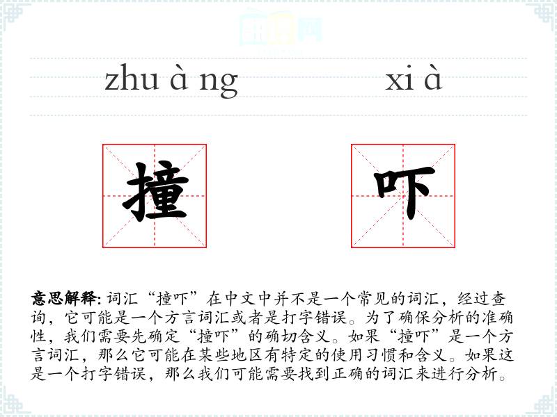 词汇“撞吓”在中文中并不是一个常见的词汇,经过查询,它可能是一个方言词汇或者是打字错误。为了确保分析的准确性,我们需要先确定“撞吓”的确切含义。如果“撞吓”是一个方言词汇,那么它可能在某些地区有特定的使用*惯和含义。如果这是一个打字错误,那么我们可能需要找到正确的词汇来进行分析。