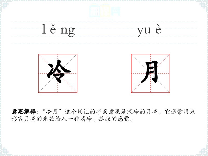 “冷月”这个词由“冷”和“月”两个字组成。在古代汉语中,“冷”字表示温度低,寒冷;“月”字表示月亮。随着时间的推移,“冷月”逐渐被用来形容月亮的清冷、孤寂的特质。