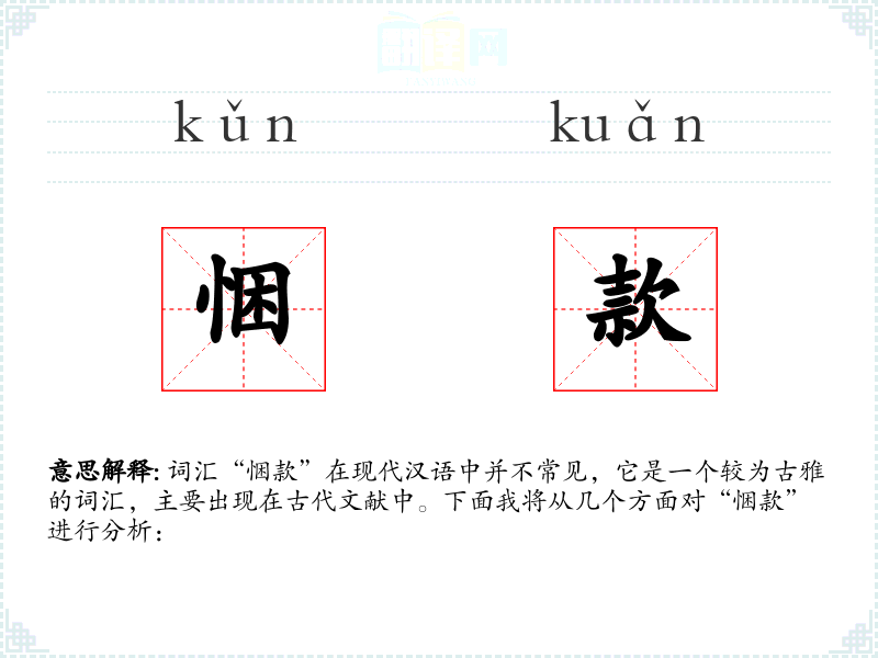 “悃”字最早见于《说文解字》,意为内心真诚。“款”字则有多种含义,包括款待、款项、款式等,在这里指的是真诚的话语。随着语言的发展,“悃款”这个词汇的使用逐渐减少,现代汉语中更多使用更为简洁的词汇来表达相似的意思。