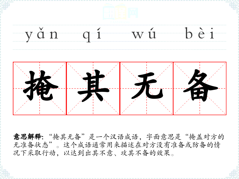 在文学作品中,“掩其无备”常用于描述战争、策略或阴谋的场景,强调利用对方的疏忽或无准备状态来取得优势。在口语中,这个成语也可以用来比喻在日常生活中抓住对方的疏忽或不经意间的机会。在专业领域,如军事、策略规划等,这个成语更是常用,强调策略的巧妙和出其不意。